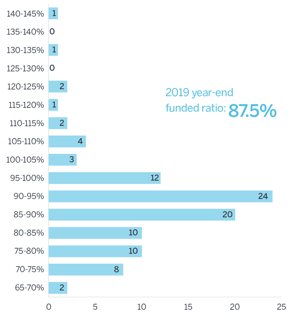 Thirteen of the 86 Milliman 100 companies with calendar fiscal years reported surplus funded status at year-end 2019, compared with 12 companies in 2018, 13 in 2017, eight in 2016, nine in 2015, eight in 2014, and 18 in 2013. These numbers pale in comparison with the 46 companies with reported surplus funded status at year-end 2007. Fifty-four of the Milliman 100 companies with calendar fiscal years reported an increase in funded ratio for 2019, compared with 39 for 2018.