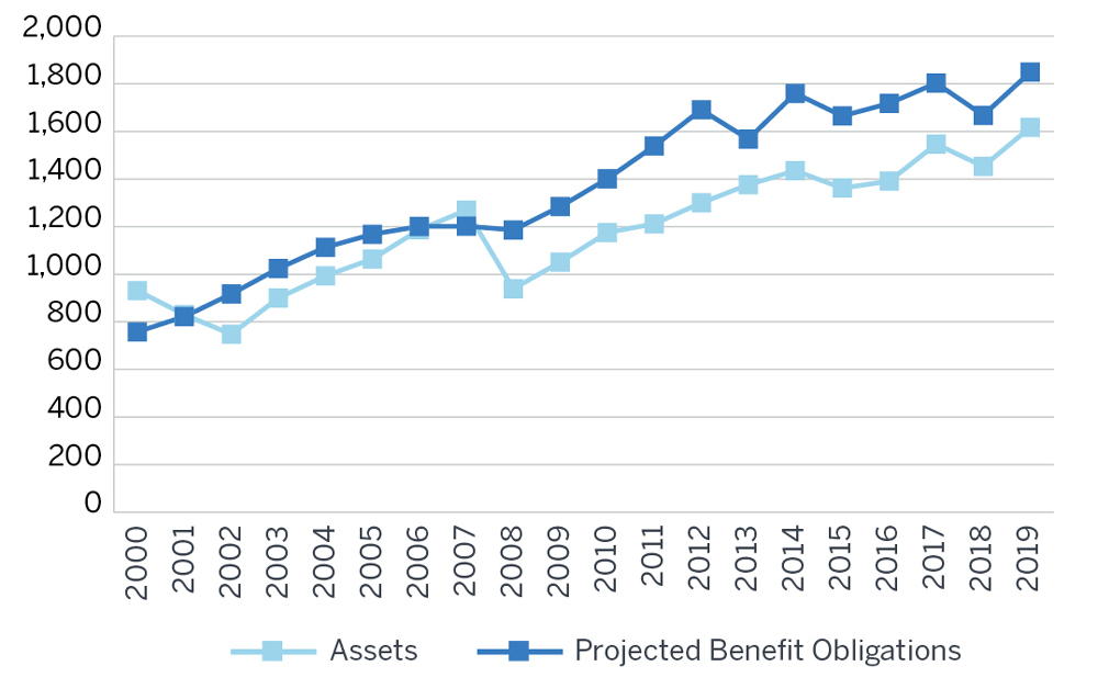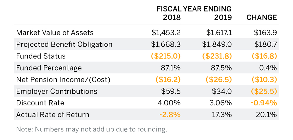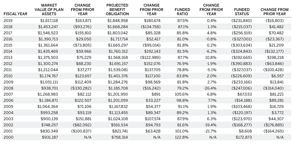 The increase in the PBO due to the lower discount rates offset the favorable investment returns of 17.3%. The net impact of investment gains, discount rates, contributions, and settlements was relatively little change. The funded ratio improved slightly from 87.1% to 87.5% in FY2019. However, due to the increase of both the assets and liabilities, the funded deficit rose by $16.8 billion in FY2019 from $215.0 billion to $231.8 billion.