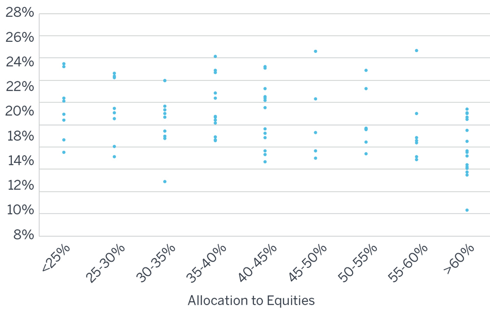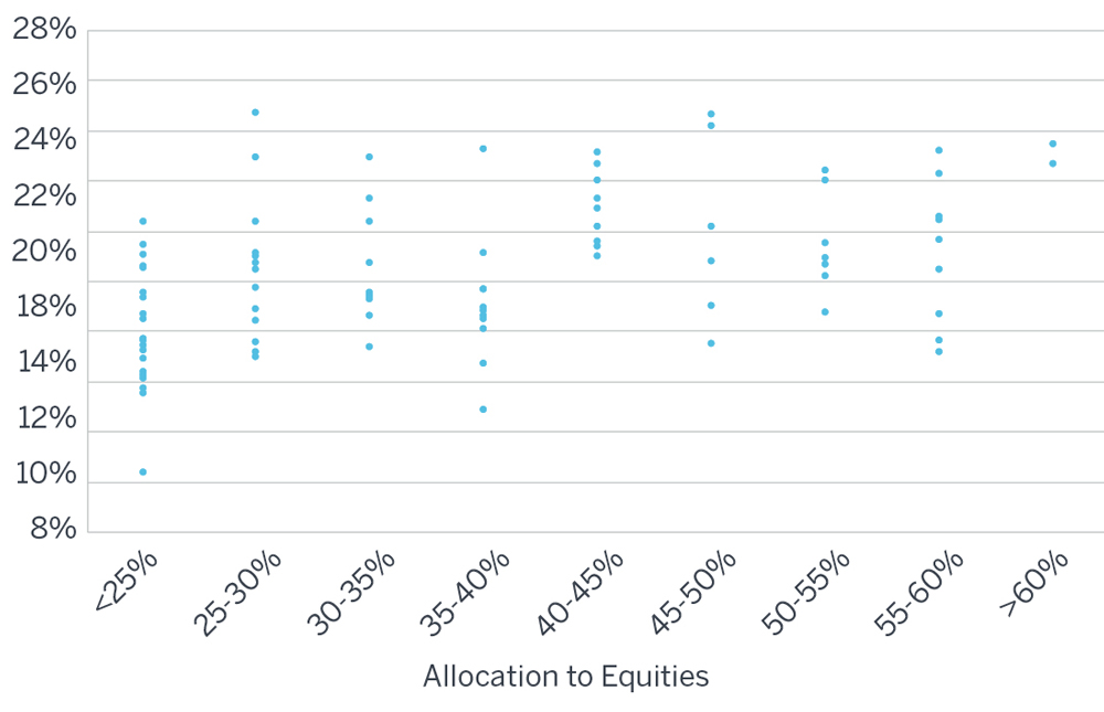 FIGURE 3: ESTIMATED RATES OF RETURN EARNED IN 2019 FOR PLANS BY THEIR ALLOCATION TO EQUITIES (CALENDAR YEAR FISCAL YEARS ONLY)