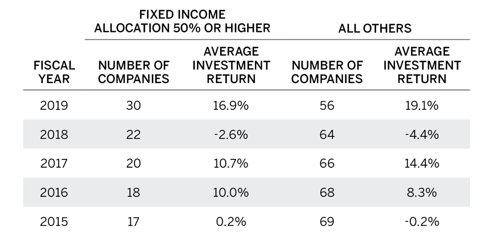 Unlike in FY2018, when plans with high allocations to fixed income (over 50%) outperformed the other plans (-2.6% average return compared with -4.4%), in FY2019 the plans with high allocations to fixed income underperformed the other plans (16.9% compared with 19.1%).