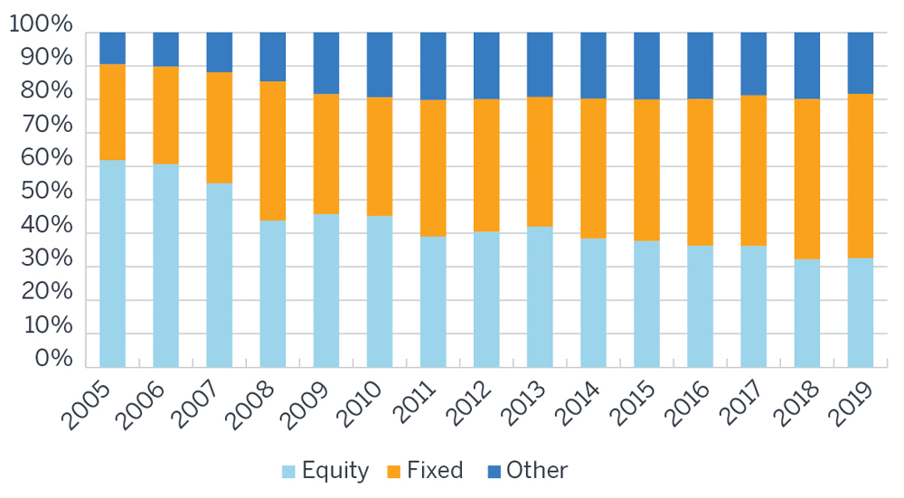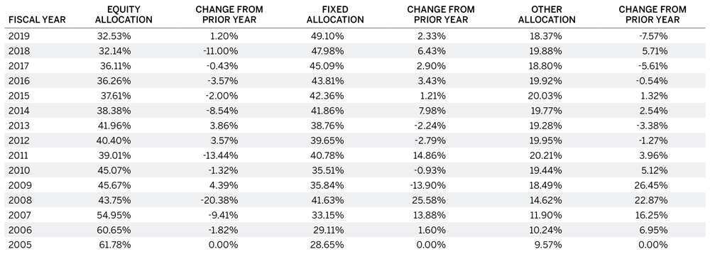 In prior years, investment allocations made by plan sponsors had showed a trend toward implementing LDI strategies. Generally, this involves shifting more assets into fixed income positions. This trend appears to have continued in 2019 as equity allocations in the pension portfolios increased slightly to an average of 32.5% during 2019, up from 32.1% at the end of 2018 (although this may just be due to surging equity prices as opposed to strategic allocation shifts). The percentage of pension fund assets allocated to equities, fixed income, and other investments was 32.5%, 49.1%, and 18.4%, respectively, at the end of FY2019, compared with 32.1%, 48.0%, and 19.9%, respectively, at the end of FY2018.