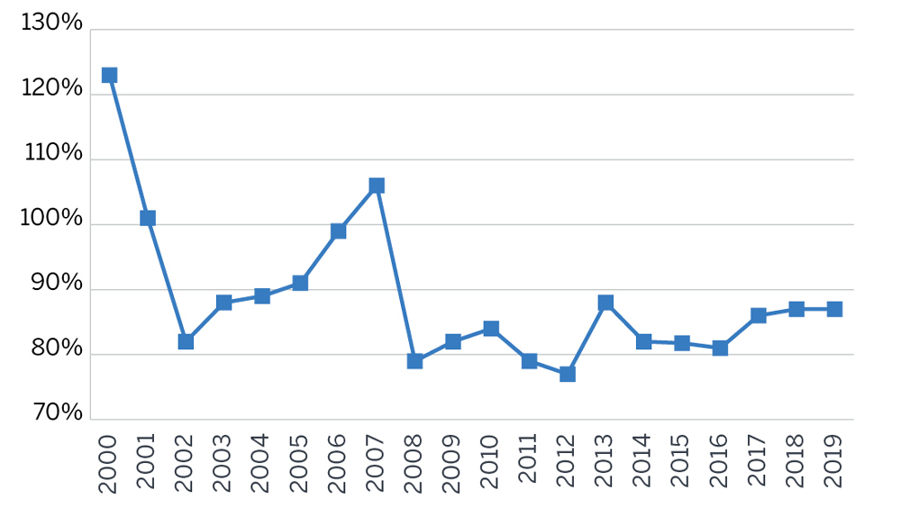 The FY2019 funded ratio of 87.5% was lower than we reported in the January 2020 Milliman 100 Pension Funding Index (PFI). The January 2020 PFI funded ratio of 89.0%, measured as of Dec. 31, 2019, was based on data collected for the 2019 Milliman Pension Funding Study. This revised funded ratio of 87.5% from our current study reflects the collection and collation of more recent publicly available information for companies with fiscal years ending in 2019.