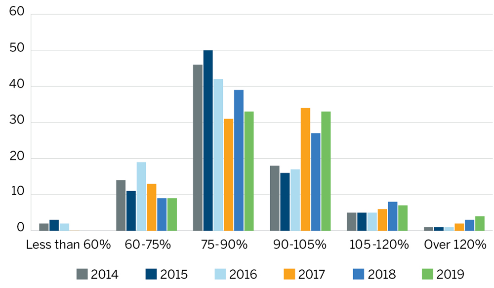 Over the last five years, the plans with consistently high allocations to fixed income have slightly underperformed the other plans while also experiencing lower funded ratio volatility. Among the 86 companies in the Milliman PFS with calendar fiscal years, 26 pension plans had fixed income allocations greater than 40.0% at the end of FY2014 and maintained an allocation of at least 40.0% through FY2019. Over this five-year period, these 26 plans experienced lower funded ratio volatility than the other 60 plans (an average funded ratio volatility of 3.4% versus 4.4% for the other 60 plans) while earning a slightly lower five-year annualized rate of return (an average of 6.6% versus 7.1%). Plans with at least 50% in fixed income have outperformed other plans over three of the last five years.