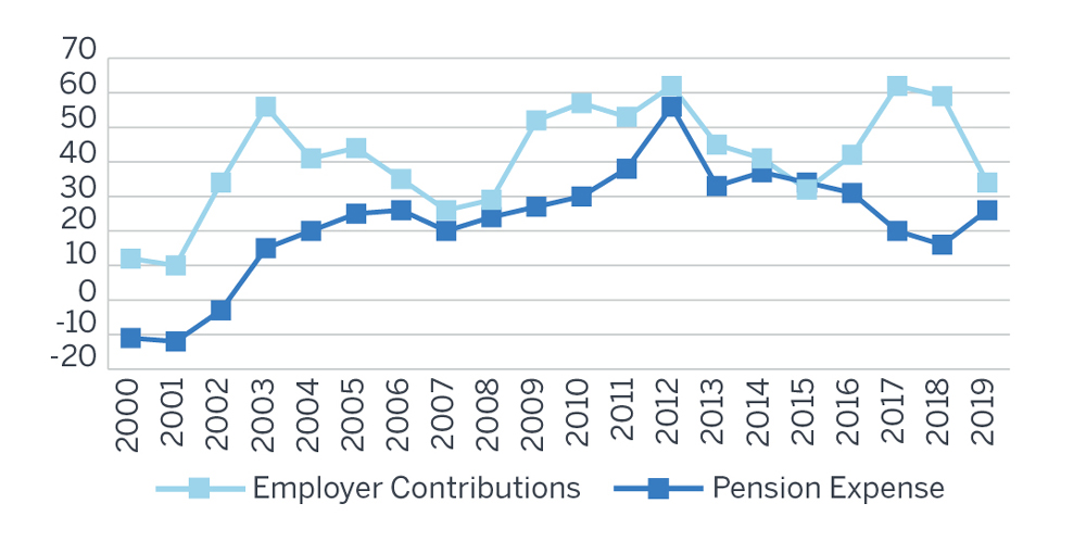 Contributions in 2019 were $34.0 billion, down significantly from 2018’s $59.5 billion. Pension expense in FY2019 increased by $10.3 billion to $26.5 billion, from $16.2 billion in FY2018.