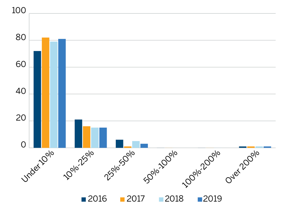 Overall, allocations to equities increased slightly during FY2019, resulting in an average allocation of 32.5%. Only two of the 100 companies had increases to their equity allocations of more than 10.0% in 2019. Five companies decreased their equity allocations by more than 10.0% in 2019, compared with 21 in 2018, one in 2017, four in 2016, five in 2015, 10 in 2014, five in 2013, four in 2012, and 10 in 2011.