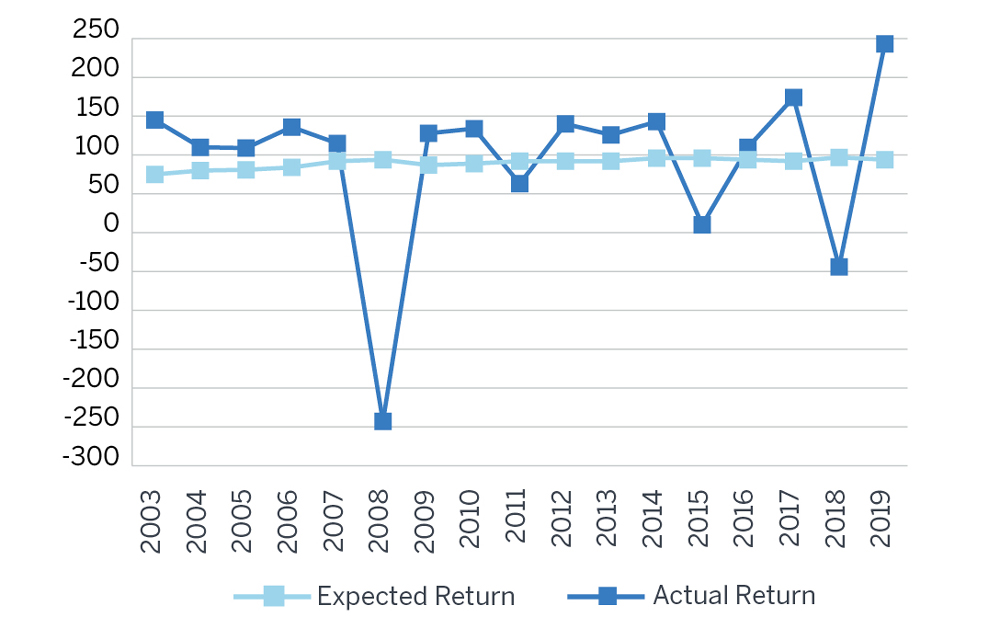 During FY2019, investment gains and contributions were partially offset by annuity purchases, lump-sum settlements and regular benefit payments and increased the market value of assets by $163.9 billion. The Milliman 100 companies’ estimated investment return for FY2019 was $242.5 billion compared with the expected return of $93.7 billion, a difference of $148.8 billion. For the five-year period ending in 2019, investment performance has averaged 6.9% compounded annually (only considering plans with calendar fiscal years). There have only been four years of investment losses over the past 20 years (2001, 2002, 2008, and 2018), contributing to an annualized investment gain of 6.3% over that period (only considering plans with calendar fiscal years).