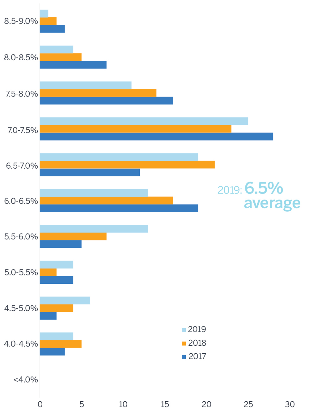 Like last year, none of the Milliman 100 companies utilized an expected rate of return for FY2019 of at least 9.0% (the highest was 8.97%). Only two companies had utilized an expected rate of return of at least 9.0% in 2012, 2011, and 2010, but this was down from four in 2009 and a high of 80 in 2000.