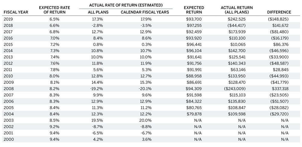 The 0.4% increase in the FY2019 funded ratio added to the improvement seen over the prior two years. Note that there has not been a funding surplus since the 105.6% funded ratio in FY2007.