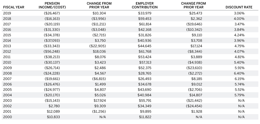 Discount rates used to measure plan obligations, determined by reference to high-quality corporate bonds, decreased during 2019, thereby increasing liabilities. The average discount rate decreased to 3.06% at the end of FY2019 from 4.00% in FY2018. For historical perspective, discount rates have generally declined from the 7.63% reported at the end of FY1999. Over the last decade, discount rate increases have only occurred during three fiscal years (2013, 2015, and 2018).
