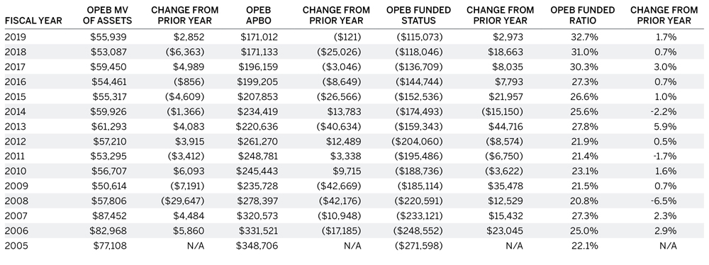 In addition to defined benefit pension plans, the PFS tracks the actuarial obligations of postretirement healthcare benefits. Accumulated postretirement benefit obligations (APBOs) have been trending downward for the past several years. In FY2019, APBOs decreased an additional $0.1 billion from their FY2018 level to $171.0 billion, despite the upward pressure on liabilities due to the large drop in discount rates seen in 2019. This is consistent with the trend by plan sponsors over the last decade of divesting other postemployment benefits (OPEB) liabilities.