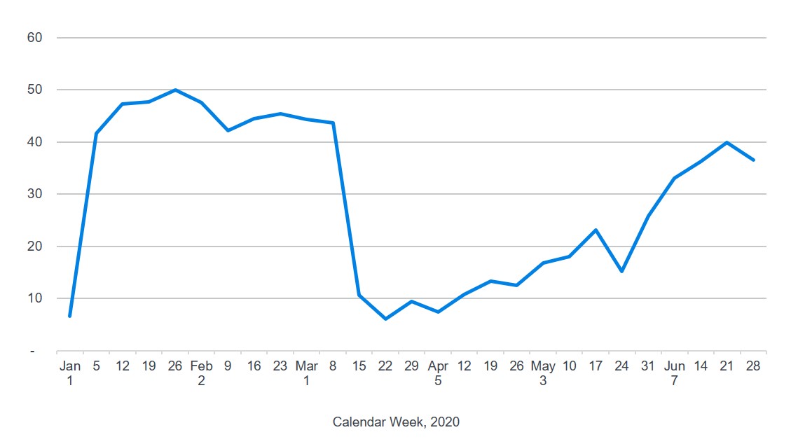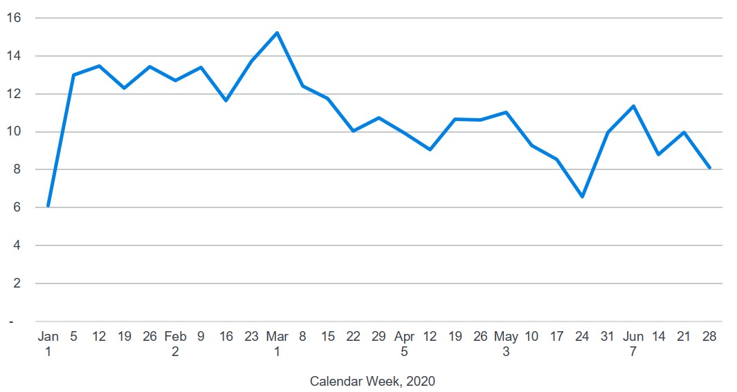 One indication of future deposition activity can be measured by claims entering the deposition process. Using the same text mining process for the Milliman database described above, we observe that, for every 1,000 open claims, the number of claims entering the deposition process is typically about 13 per week. This fell to about nine per week in April and has remained at this level since that time, suggesting that attorneys have been reluctant to initiate depositions in the current environment. That reluctance may change as the availability of deponents for claims already in the deposition process continues to decline and as virtual depositions become more widely seen as the "new normal."