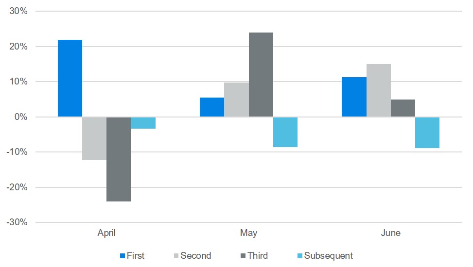 In May and June, first through third depositions all increased proportionally relative to the February and March time period (becoming 15% more likely from 5%). Later depositions continued to be stalled.