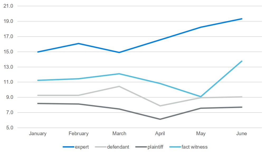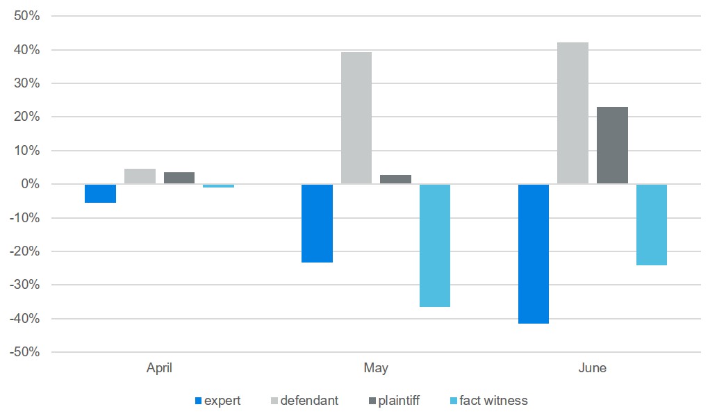 Much of this shift has resulted from deposing proportionally more plaintiffs and defendants, whose depositions occur earlier in the process. Hence their depositions are less reliant on prior discovery and easier to schedule earlier. At the same time, attorneys have deposed fewer fact witnesses and expert witnesses. Attorneys may be less inclined to depose expert witnesses over virtual platforms. While the depositions of fact witnesses are usually shorter and hence better suited for virtual platforms, they must usually follow the plaintiff and defendant in the timeline and hence cannot be scheduled earlier as readily.