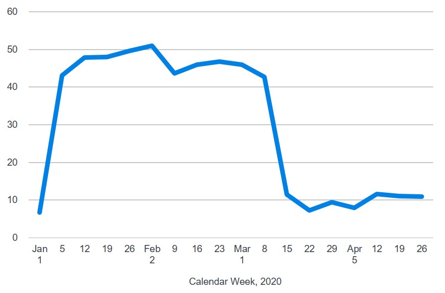 Prior to March 15, defense attorneys attended about 47 depositions weekly for every 1,000 open claims. In the second half of March, this decreased to about nine per week, an 80% decline. The depositions that remained on the calendar were typically conducted virtually (more on this in a later article).
