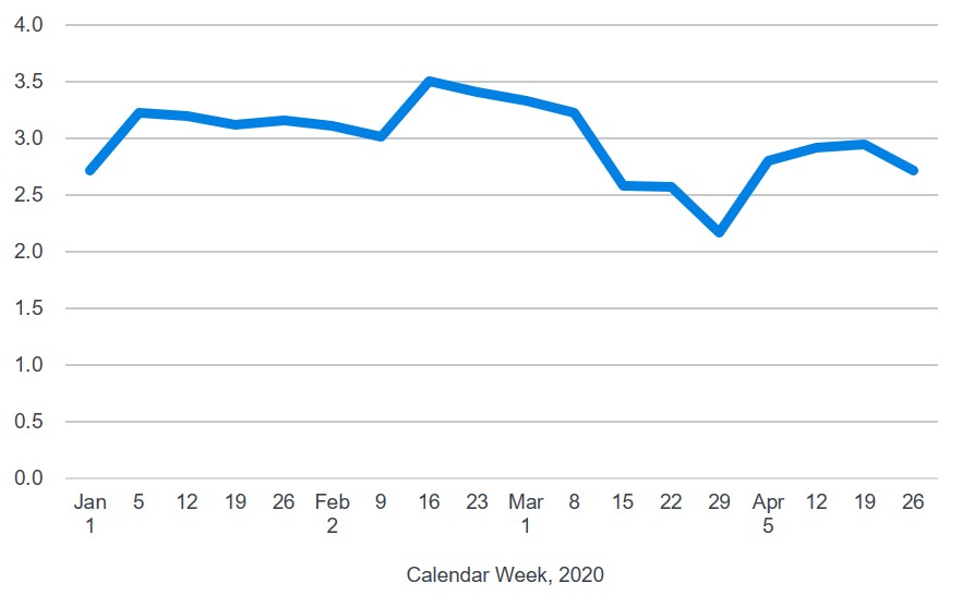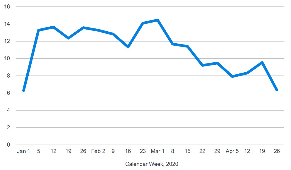 For every 1,000 open claims, about 13 will enter the deposition process in any given week. This fell to eight per week in April as attorneys were reluctant to plan depositions in the uncertainty of this time. Even as some attorneys have gotten comfortable with virtual platforms and certain states have permitted businesses to re-open, there is no increase in this metric by month-end. Signs of first deposition activity were less at the end of April than at the beginning.