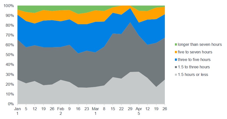 Close to a third of depositions in late March and early April lasted an hour and a half or less. Typically, depositions of this length make up only a fifth of the total. Almost half of all depositions last longer than three hours and 15% longer than five hours. During the second half of March, these longer depositions became rare, with only 25% longer than three hours and 5% longer than five hours. Full-day depositions, while never common, were almost unheard of during this time period. Attorneys may be waiting until they can conduct full-day depositions in person or choosing to conduct them remotely in multiple segments.