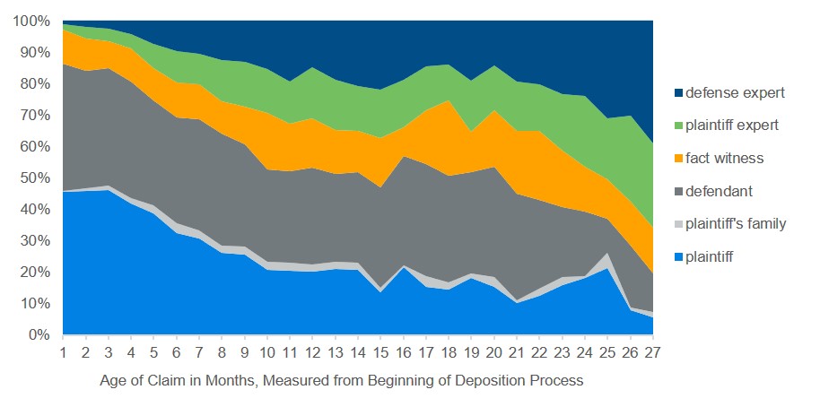 We can group deponents broadly into six categories: plaintiff, plaintiff’s family members, defendant, fact witness, and expert - either for the plaintiff or for the defense. Attorneys tend to depose the plaintiff and defendant toward the beginning of the discovery phase. Expert witness depositions typically end the discovery phase of a lawsuit. However, in the chart below, we measure the age of the claim from the beginning of the “deposition process.” We are distinguishing the deposition process from discovery more broadly because written discovery and document production can presumably continue in the same manner under social distancing unlike much deposition work.