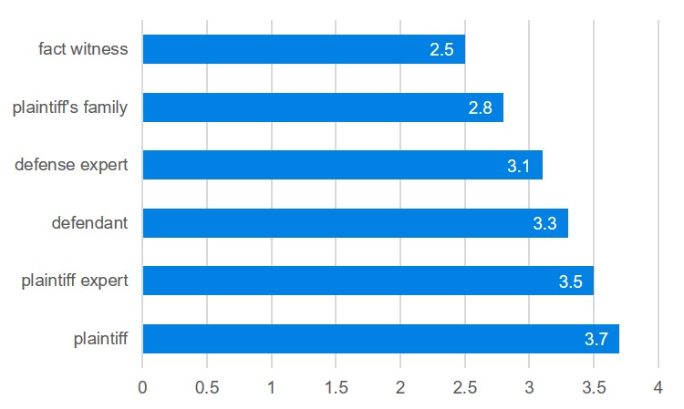 Depositions of the plaintiff are lengthier than those of other witnesses, lasting on average 3.7 hours. The shortest are the plaintiff’s family members and fact witnesses, lasting on average 2.8 hours and 2.5 hours, respectively. Defendants and expert witnesses are closer to the overall average of 3.3 hours.