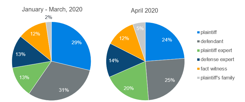 Because depositions of the plaintiff’s family and fact witnesses are shorter and perhaps easier to conduct virtually for other reasons, we’d expect more of these to go forward under social distancing. This shift occurs but not until April, perhaps suggesting the depositions taken in late March were previously scheduled and later moved to virtual platforms. Depositions initially scheduled for later in the calendar may also have been moved to April if identified as good candidates for a virtual platform. The pie charts below show this shift away from the plaintiff and defendant and toward other witness categories.