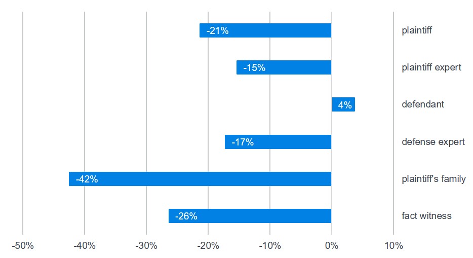 All witness types except defendants have contributed to the decline in deposition length after March 15. Those whose depositions were shorter to begin with decreased in length more than others. While the average length of expert depositions decreased by 16% and plaintiffs by 21%, fact witnesses decreased by 26% and plaintiff’s family members by 42%.