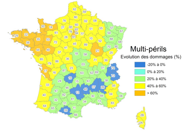 - In the metropole, the total annual mean cost of events (all things being equal) is expected to grow by 35% over 30 years. Looking at stand-alone impact by peril, the average annual loss will increase by 28% for droughts, 38% for floods, most likely linked to an increase in the frequency of heavy rains, and 82% for coastal submersions.