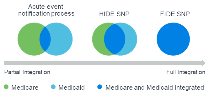 Beginning in CY 2021, D-SNPs were required to meet new minimum integration standards through at least one of the three avenues shown in Figure 7: Fully Integrated D-SNP (FIDE SNP), Highly Integrated D-SNP (HIDE SNP), or an acute event notification process (“coordination only”) between the D-SNP and the state Medicaid agency.3,4