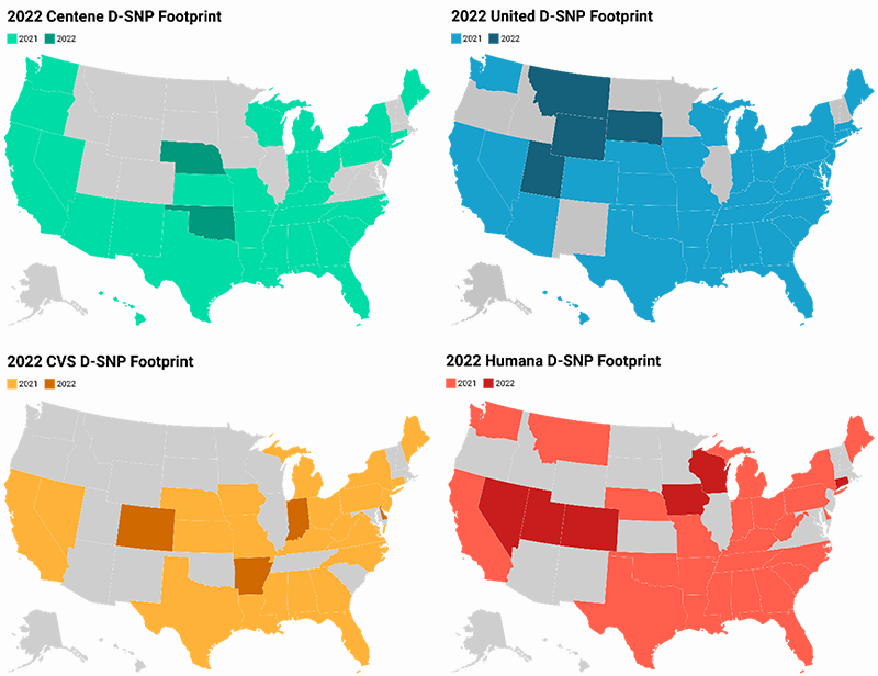 Humana will expand its D-SNP footprint significantly in CY 2022 by offering or acquiring D-SNPs in six new states (Colorado, Connecticut, Iowa, Nevada, Utah, and Wisconsin). Molina HealthCare also expanded in CY 2022 with five new states and UnitedHealthcare added four states.