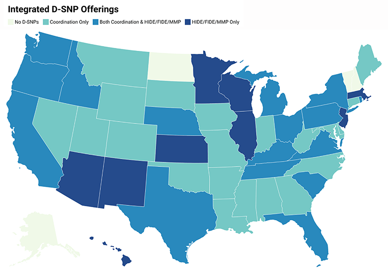 D-SNP offerings in eleven states (including Puerto Rico and Washington D.C.) are limited to HIDE, FIDE, or MMP plans. Figure 9 illustrates whether each state offers coordination only plans, only integrated plans, or a combination of both in CY 2022.
