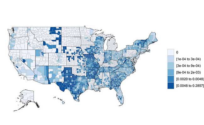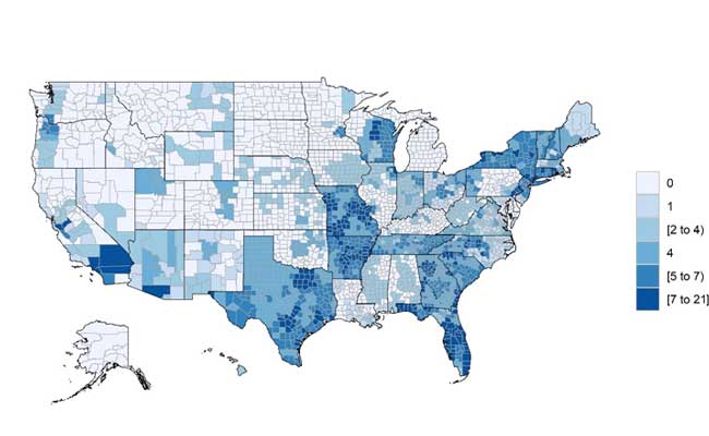 Finally, we show where these plans are concentrated nationwide, illustrating a heat map of the United States. Figure 4 highlights which counties have the most MA plans with LTSS benefits. Figure 5 shows the counties with the highest density of plans offering LTSS-type benefits for each MA-enrolled member as of January 2019.