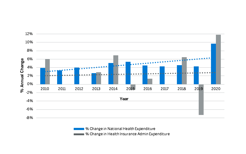 2 Calculated from Kaiser Family Foundation exhibit data (Net cost of health insurance and government administration, as a share of total health expenditures), available at https://www.healthsystemtracker.org/chart-collection/u-s-spending-healthcare-changed-time/.
