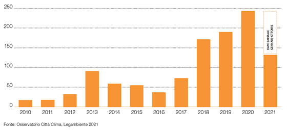 3 LEGAMBIENTE, Rapporto Osservatorio Città-Clima 2021, op cit., pages 15 and 27.