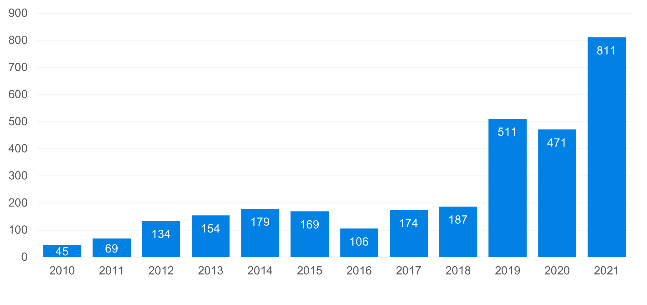 Figure 1: Number of extreme weather events in Italy from 2010 to October 20212
