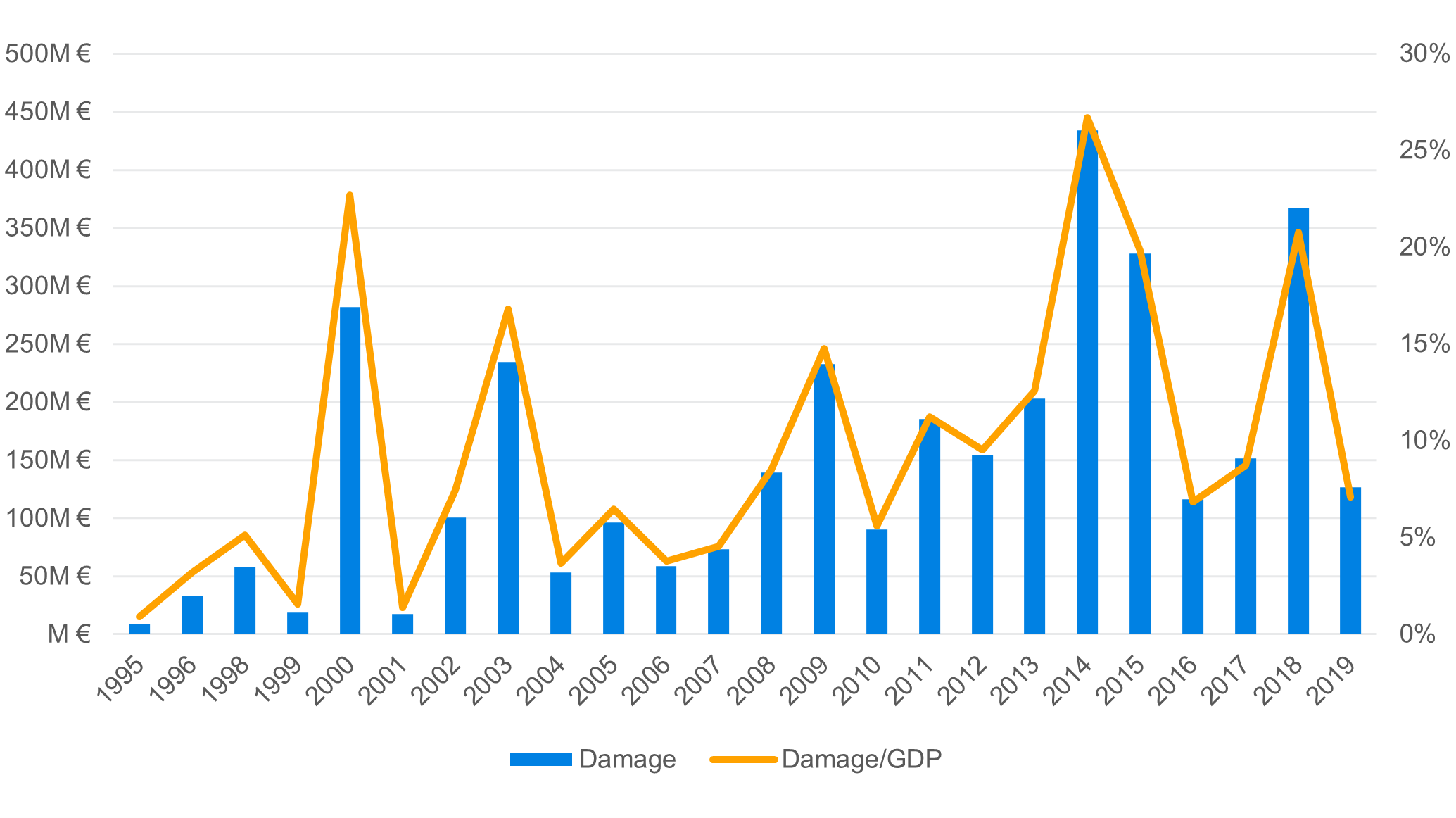 Figure 3: Economic costs of floods in Italy compared to GDP (1995-2019)
