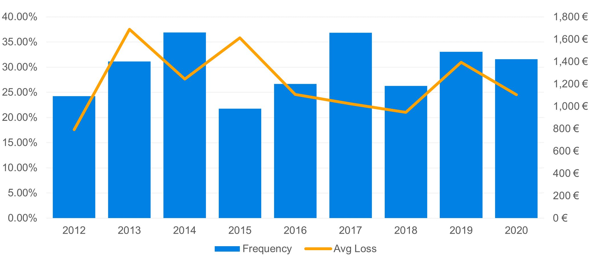 Figure 4: Hail claims frequency and average loss for multi-risk policies
