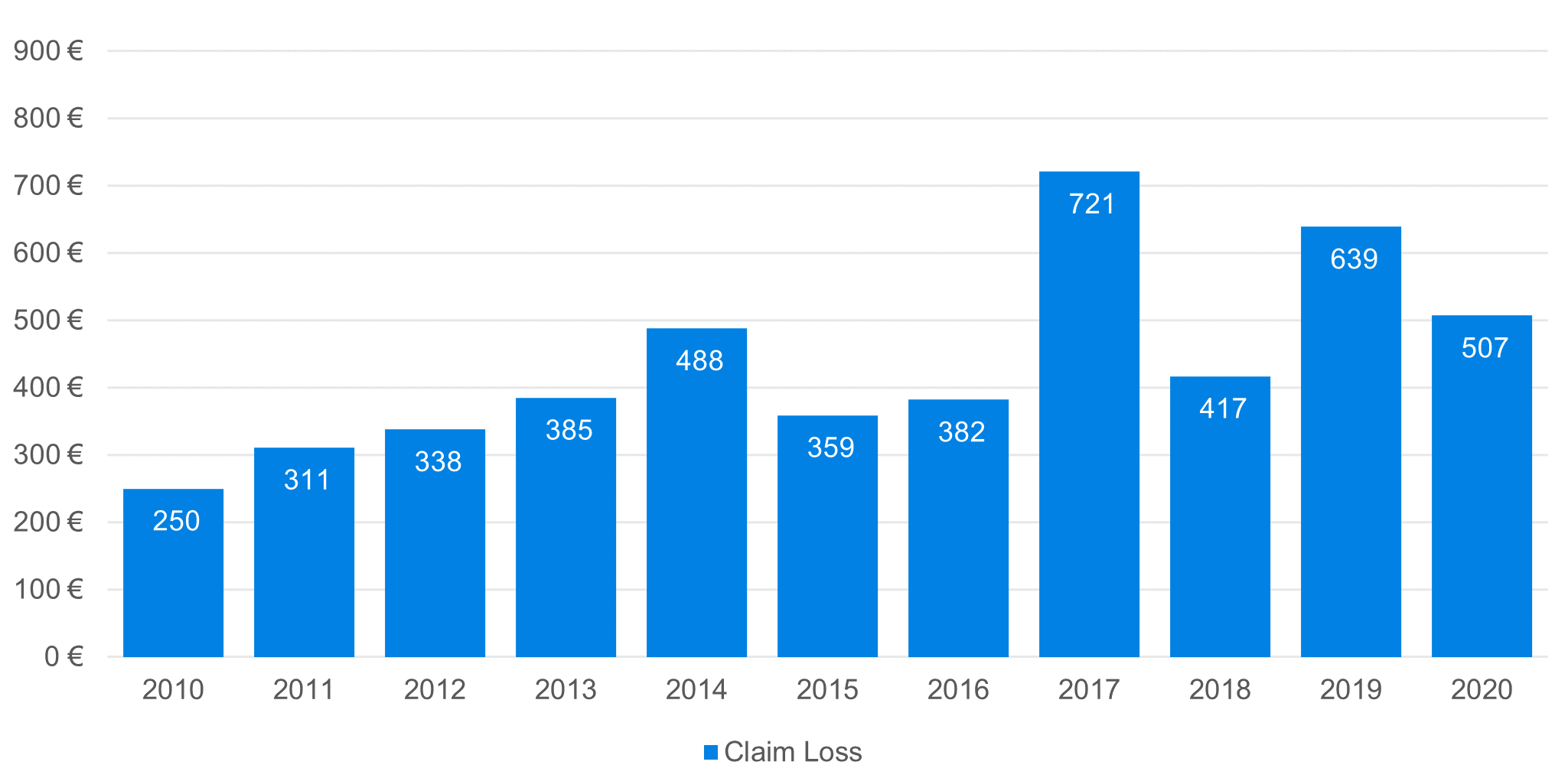 Additionally, ANIA provides annual income statements for claims losses that occurred from 2010 to 2020. Although 2015 and 2016 were countertrend years, insurer losses due to hail events since 2010 follow an increasing trend, as shown in the chart in Figure 5.9